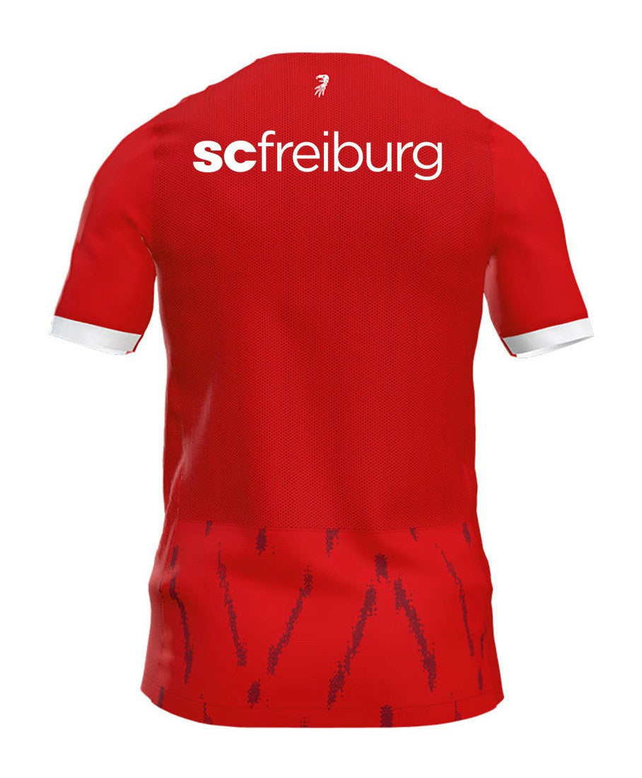 La nueva camiseta titular del Freiburg es predominantemente roja, con detalles en blanco y negro. El diseño presenta un patrón gráfico abstracto en blanco en la parte delantera, inspirado en la ciudad de Freiburg y su historia. La gola es redonda en blanco, con detalles en negro. Las mangas también son rojas, con detalles en blanco en los bordes. El escudo del club se coloca en el lado izquierdo del pecho, en su versión tradicional, con el logo de Nike en blanco en el lado derecho. El patrocinio principal de "Schwarzwald-Baar Klinikum" aparece en blanco en la parte delantera de la camiseta.